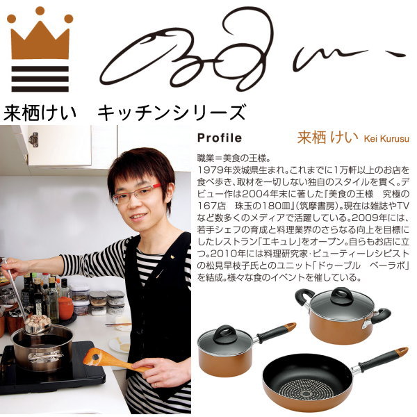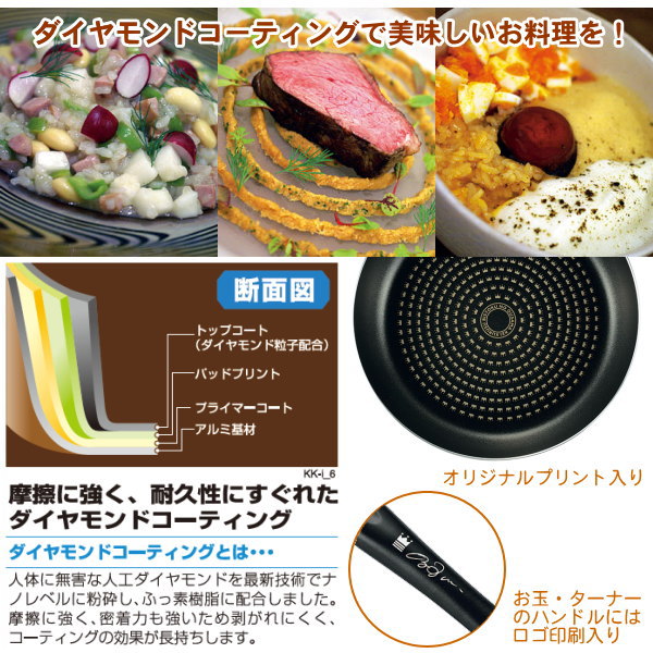 ・「美食の王様」来栖けいのキッチンシリーズ! ・摩擦に強く、耐久性に優れたダイヤモンドコーティング採用! 人体に無害な人工ダイヤモンドを最新技術でナノレベルに粉砕し、フッ素樹脂に配合しました。